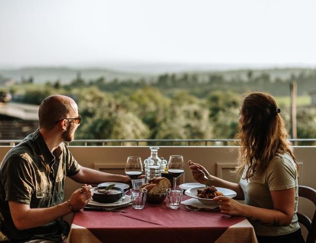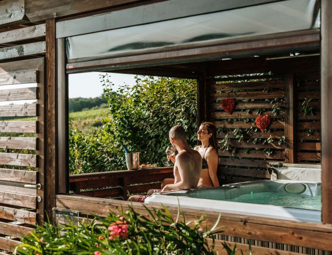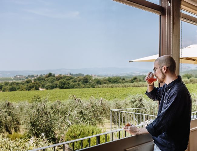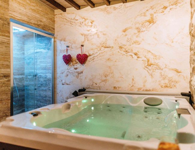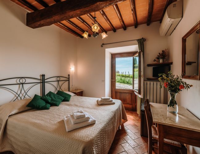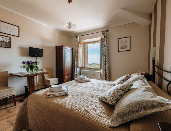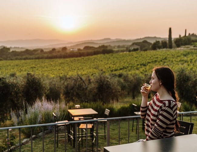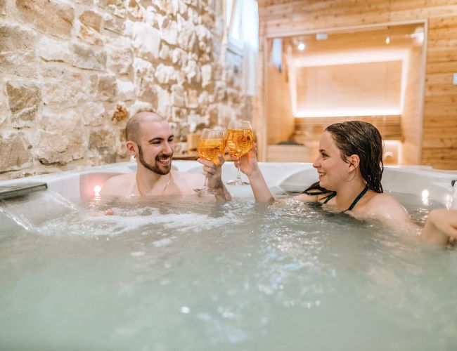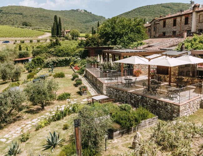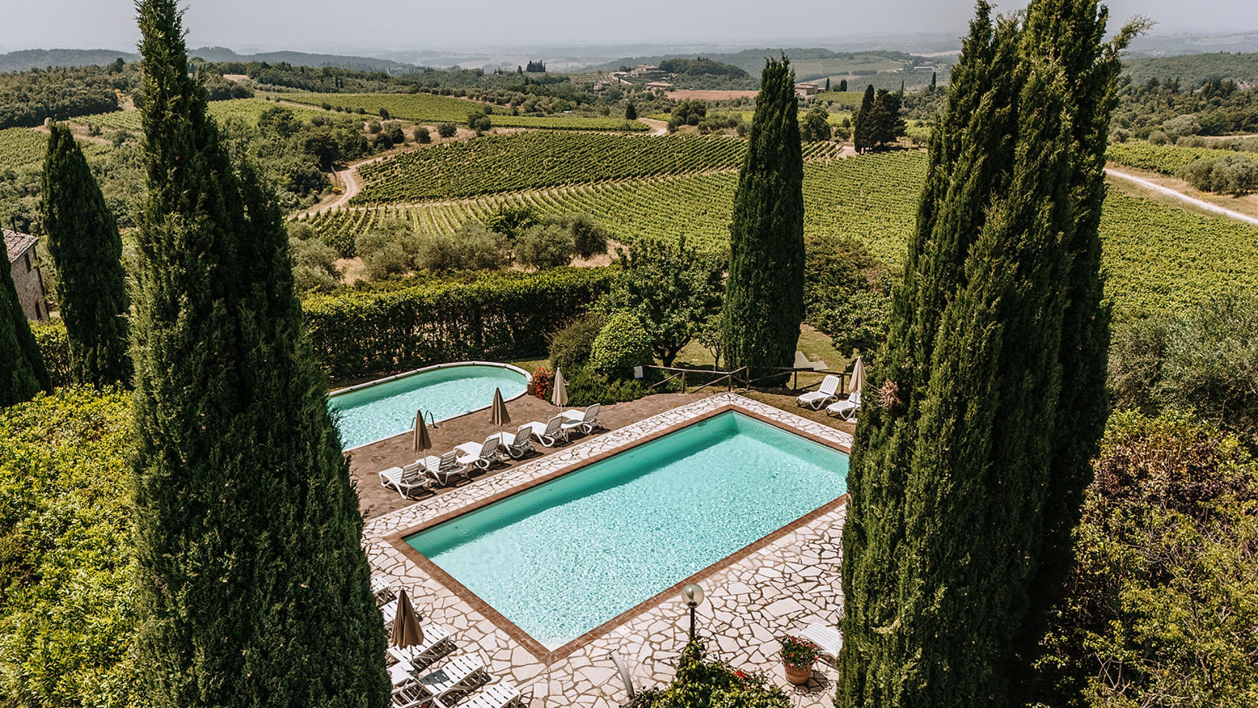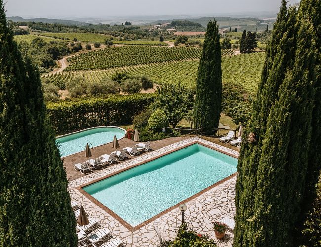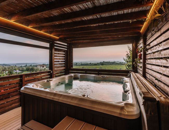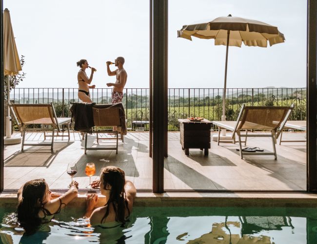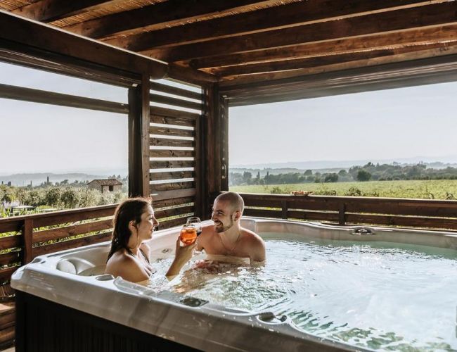 - pernottamento in Suite Chiantigiana sviluppata su due livelli con al piano terra giardino privato con tavolo sedie e lettini prendisole e fontana di acqua potabile, cucina soggiorno interna; al primo piano bagno privato e ampia camera matrimoniale con travi originali di castagno e ampia finestra panoramica con vista su Siena e sul Chianti - ingresso alle due piscine esterne panoramiche in comune con gli altri ospiti; - ingresso di 1 ora in esclusiva all'Isola del Benessere jacuzzi esterna;