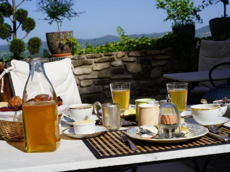 La Tavola Comune (Table d'hôtes), disponibile su prenotazione, è il regno di Bruno. Lo chef personale crea menù gourmet interamente fatti in casa con prodotti locali e stagionali. Le cene vengono servite sulla terrazza con vista sulle montagne delle Cévennes, offrendo agli ospiti la scelta di cenare in privacy o condividere il pasto con i padroni di casa. La cantina offre gemme della Côtes du Rhône e visite guidate condotte personalmente da Bruno.