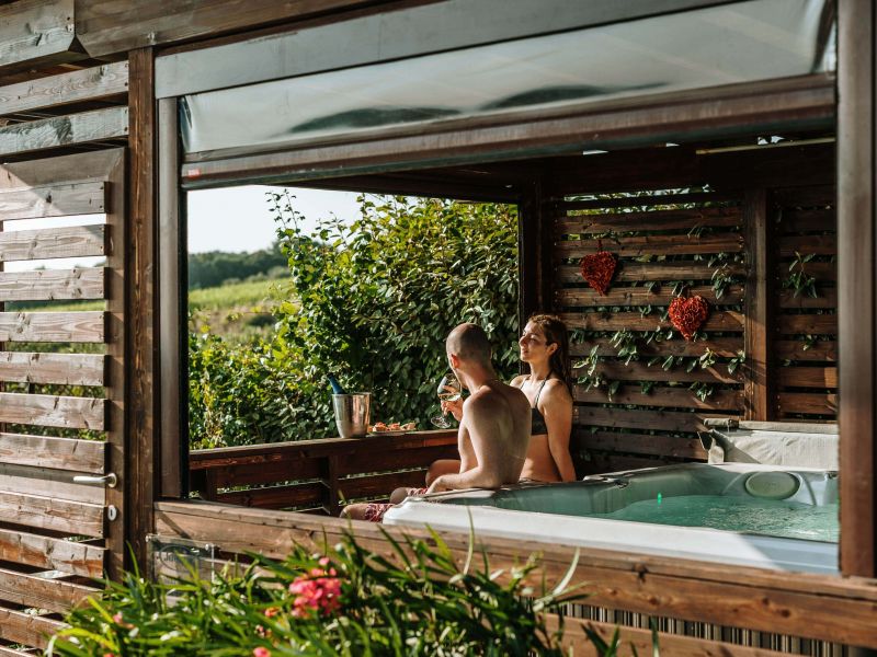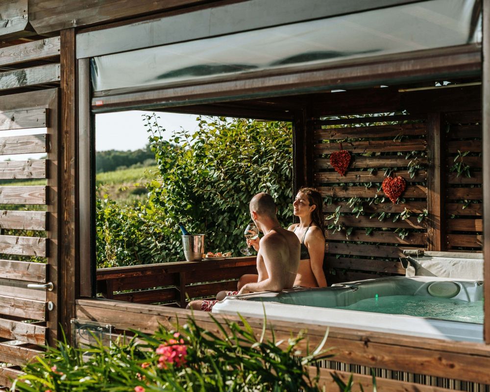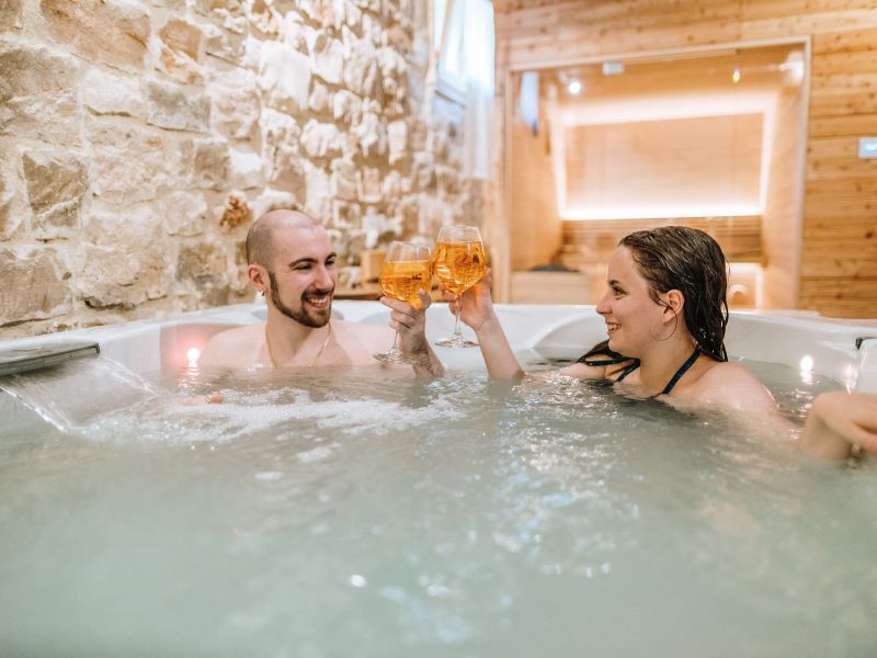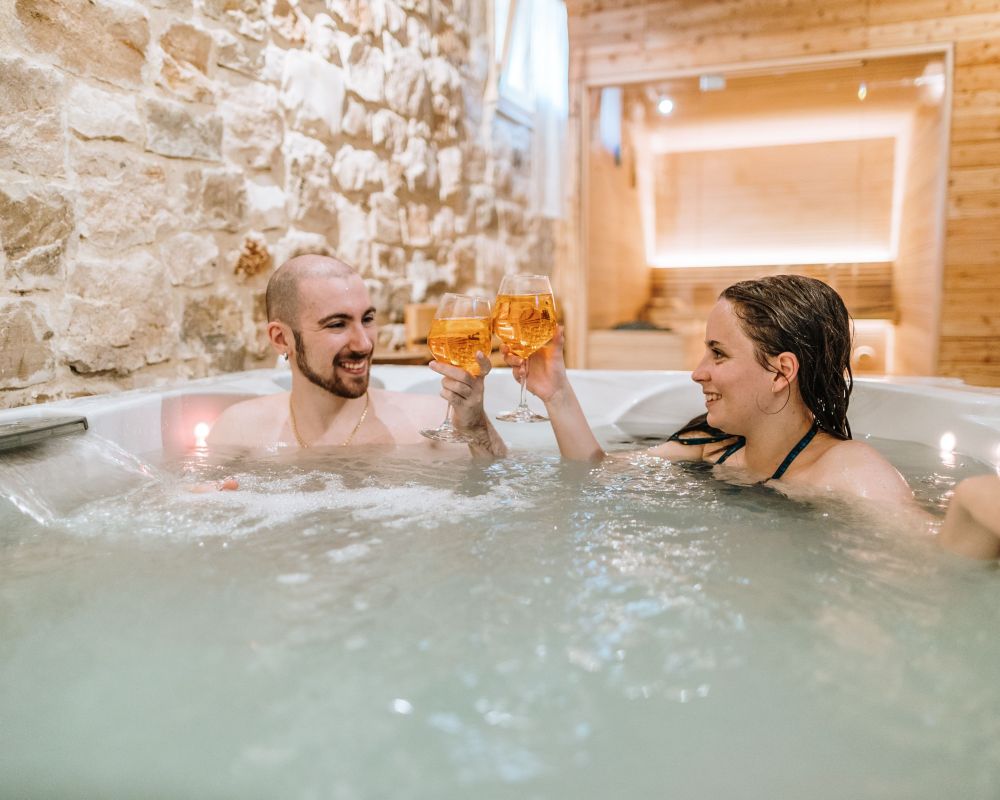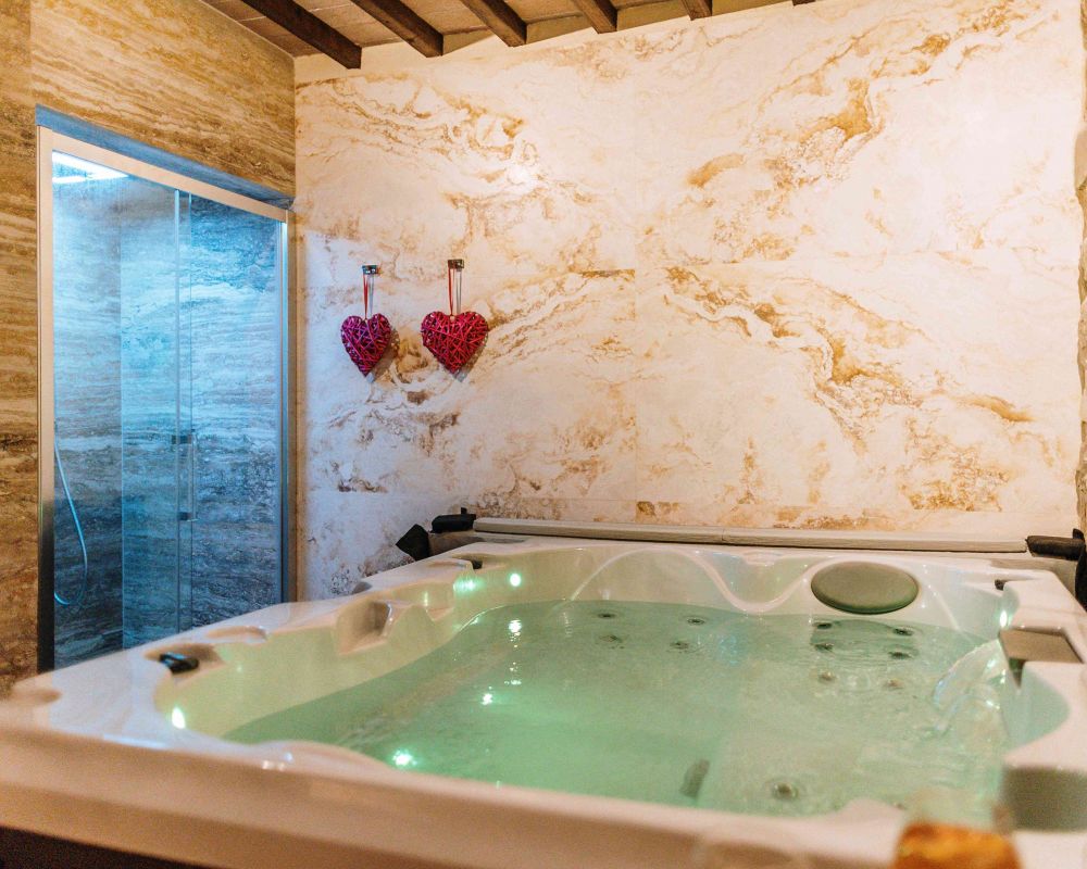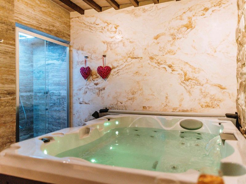 Vasca Idromassaggio Jacuzzi: È dotata di 19 getti e può ospitare fino a 3 persone: 2 sedute ergonomiche e 1 seduta lounge per distendersi e immergere completamente il corpo, garantendo una lenitiva azione massaggiante. È inoltre dotata di funzioni avanzate: la cascata e l’illuminazione a LED per un rilassamento totale.